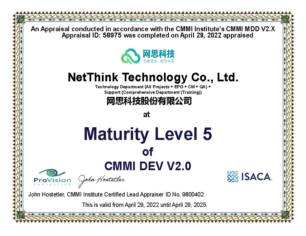6月10日,网思科技成功通过了全球软件领域最高级别CMMI V2.0 五级认证,证明网思科技在软件开发领域的持续投入和技术实力再次获得该国际权威机构的高度认可。CMMI全称为Capability Maturity Model Integration,即能力成熟度模型集成,是国际上用于评价软件企业能力成熟度和过程规范性的一项重要标准。CMMI共设5个级别,从1